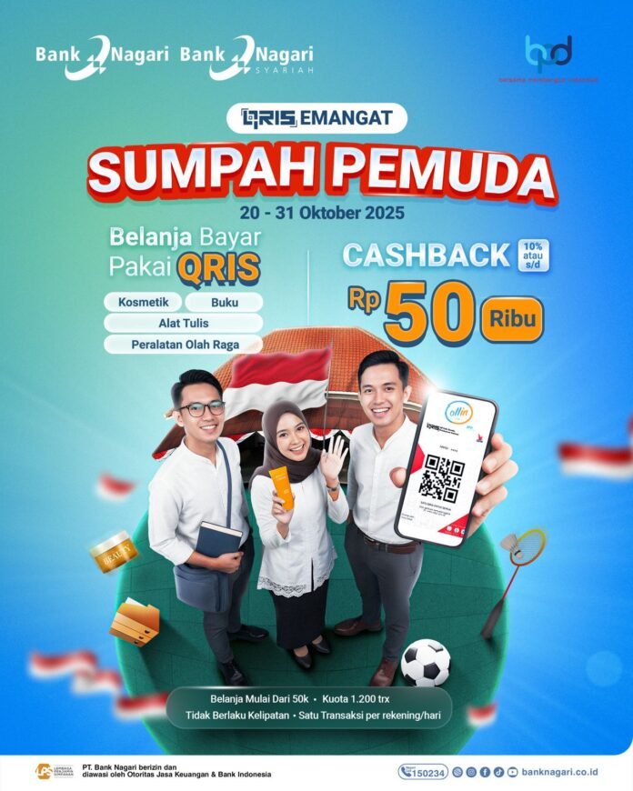 Lubuk Sikaping- kabatv — Dalam rangka memperingati Hari Sumpah Pemuda yang jatuh pada tanggal 28 Oktober, Bank Nagari menghadirkan berbagai promo menarik bagi para nasabah dan masyarakat umum. Promo ini berlangsung mulai dari tanggal 20 hingga 31 Oktober 2025 dengan tema “QRIS Emangat Sumpah Pemuda.”