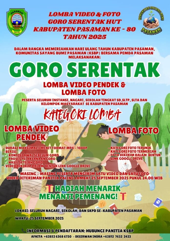 Pasaman – kabatv – Dalam rangka memperingati Hari Ulang Tahun (HUT) Kabupaten Pasaman ke-80 tahun 2025, Komunitas Sayang Bumi Pasaman (KSBP) bekerja sama dengan Pemerintah Daerah Kabupaten Pasaman menggelar Lomba Video Pendek dan Lomba Foto Goro Serentak.