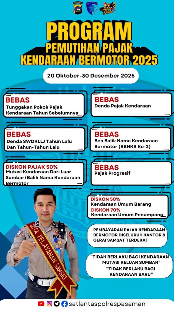 Pasaman – kabatv– Direktorat Lalu Lintas (Ditlantas) Polda Sumatera Barat kembali menghadirkan Program Pemutihan Pajak Kendaraan Bermotor Tahun 2025, yang berlangsung mulai 20 Oktober hingga 30 Desember 2025. Program ini memberikan berbagai keringanan dan pembebasan pajak bagi masyarakat pemilik kendaraan bermotor di seluruh Sumatera Barat.