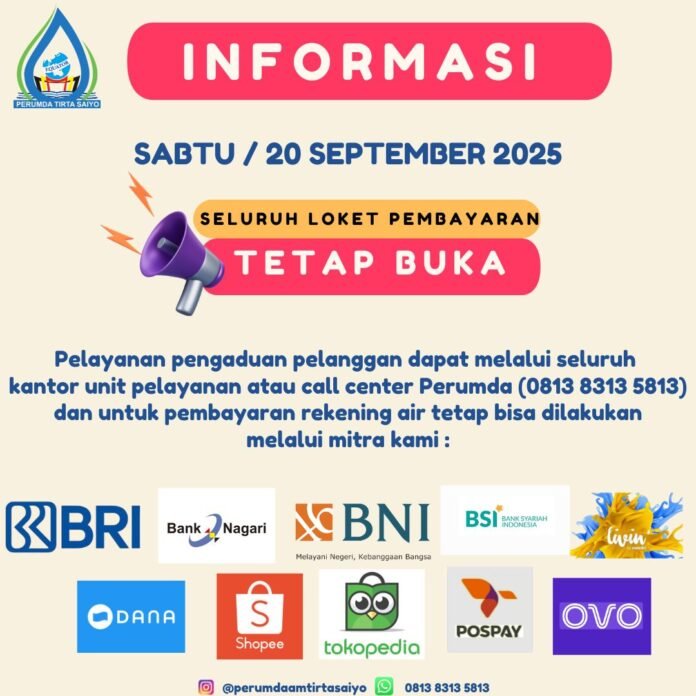 Lubuk Sikaping – kabatv – Perusahaan Umum Daerah (Perumda) Air Minum Tirta Saiyo mengumumkan bahwa seluruh loket pembayaran akan tetap buka pada Sabtu, 20 September 2025. Kebijakan ini dilakukan untuk memberikan kemudahan bagi pelanggan dalam melakukan pembayaran rekening air.